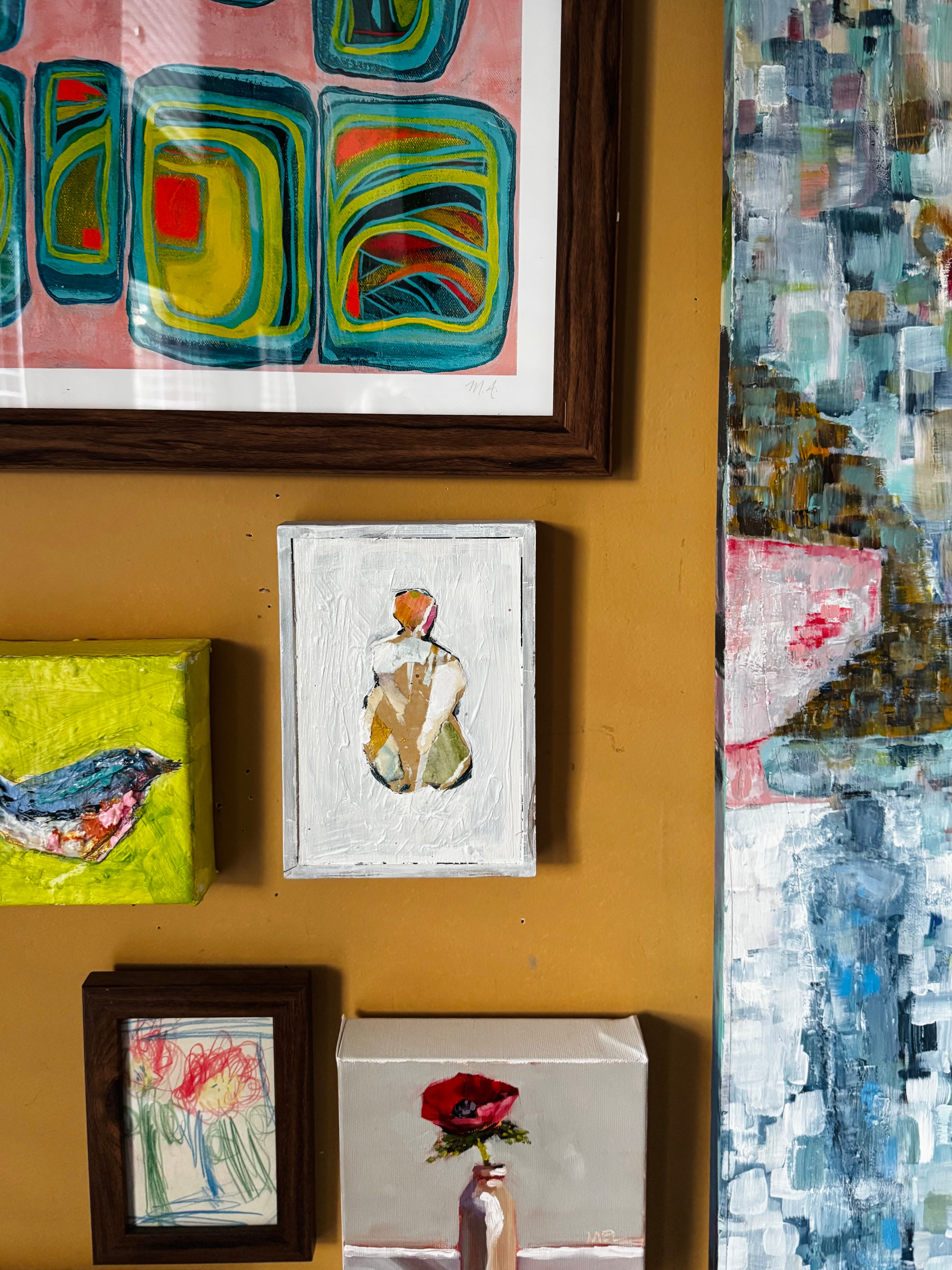 I’ve rearranged my gallery wall, a corner that sort of hugs my “morning spot” with color and memories. There are paintings by talented friends, artwork by me, ones I consider “keepers” and a couple of pieces by an emerging artist named Elizabeth.
